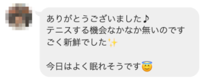 テニス経験がない人も、1時間程度練習をしたら、楽しめる程度までレベルアップしました♪