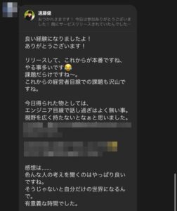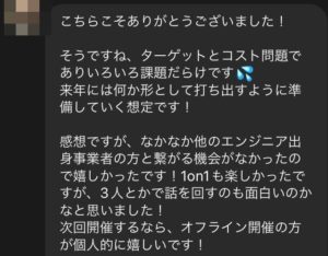 起業に興味があるフリーランスエンジニアの方も参加したので、非常に勉強になったと思います。
