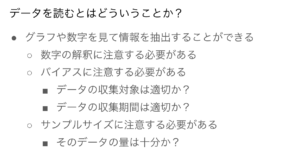 そもそも『データ(数値や可視化されたグラフ)を使う』のは、個人の解釈や偏見(偏り)ではなく、事実を元に、物事の判断や意思決定をするために使用するという前提から講義がありました。
