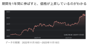 しかし、データ(グラフ)の期間を1年間として見てみると、価格推移は上がり続けていることがわかります。