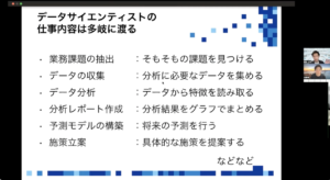 講師の方は、ITベンチャーの人事をはじめ、データサイエンスに関する講師業などもされている方をお招きました。