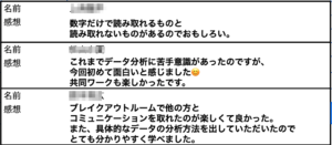 僕も混ざって参加者同士で、エクセルの関数を使ってデータを読み取り、次なる打ち手となりうることをいくつか出しましたが、回答は間違いではないものの、本質的なものではなかったです。
