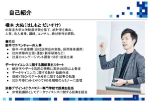 講師の方は、ITベンチャーの人事をはじめ、データサイエンスに関する講師業などもされている方をお招きました。