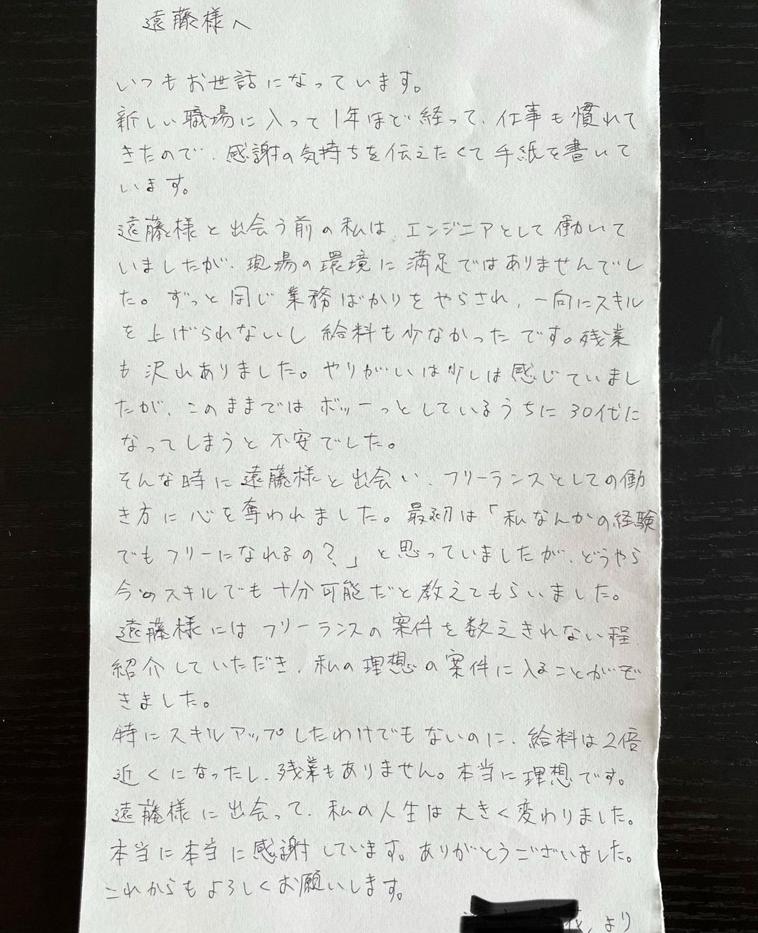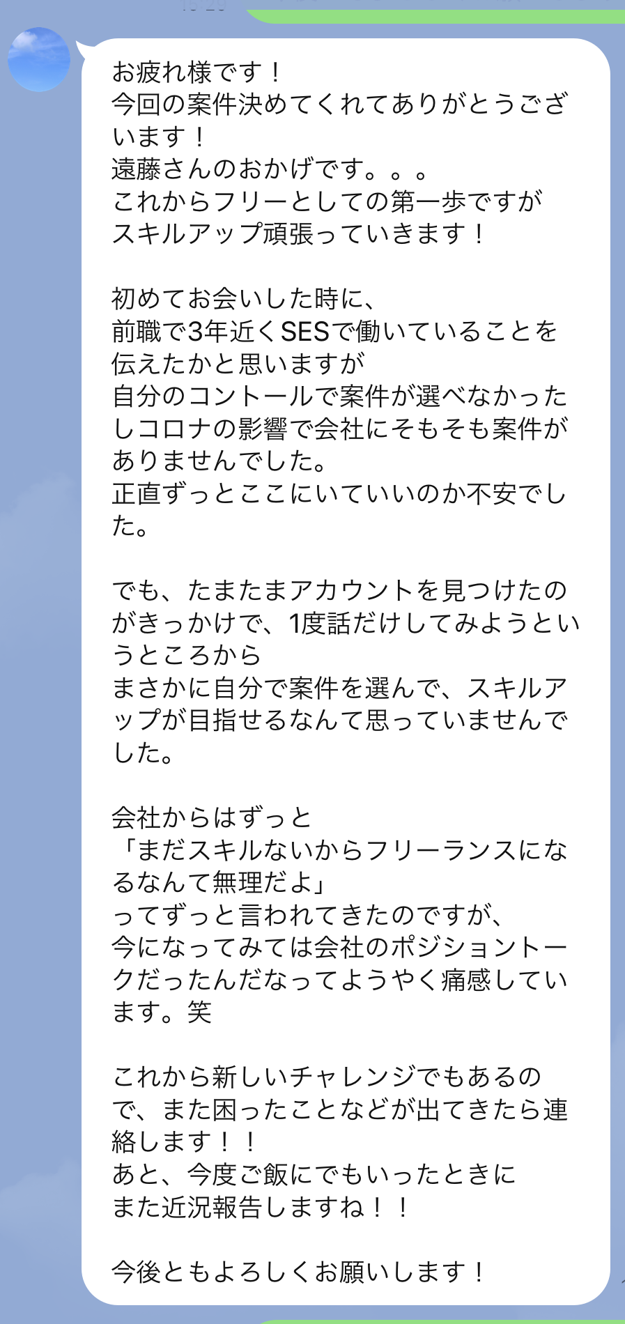 僕がご協力させていただき、会社員からフリーランスに転身した方から頂いた感想です。