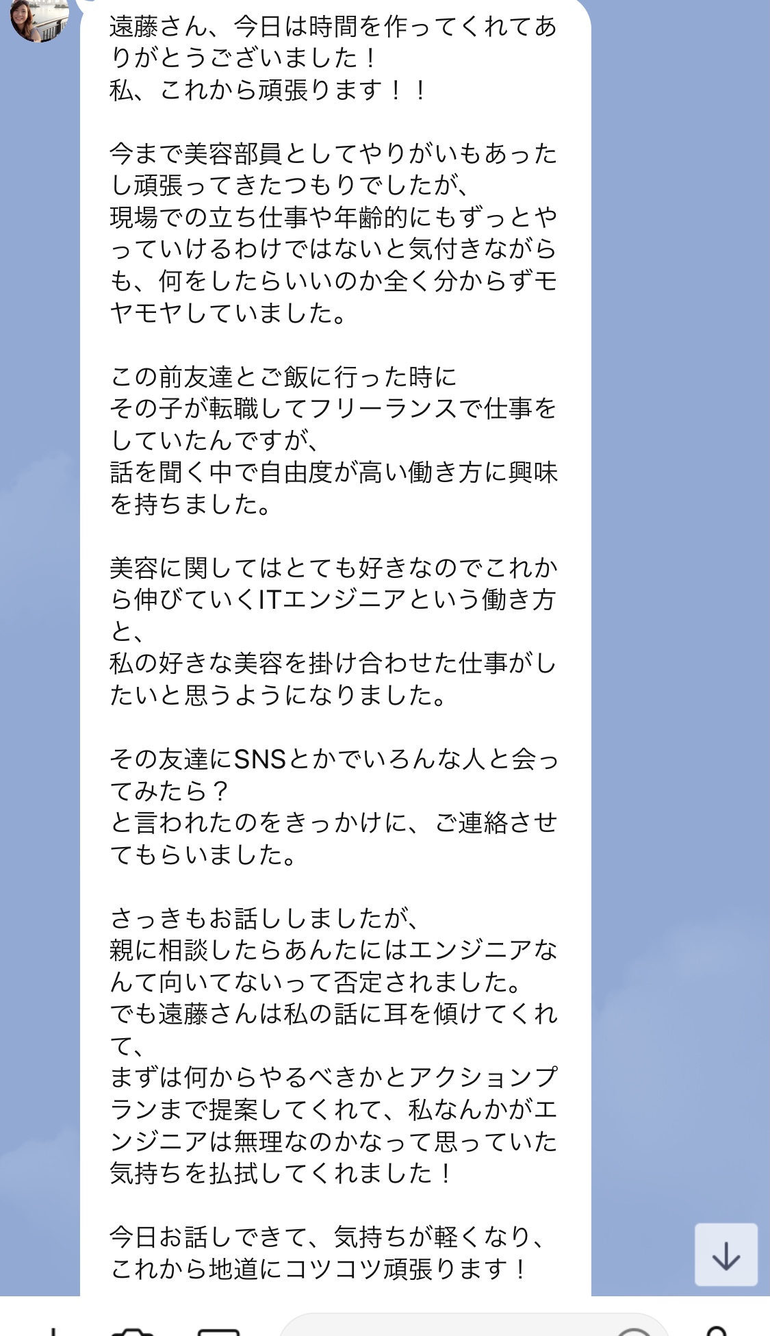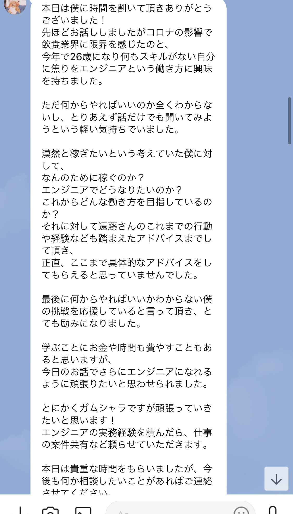 エンジニアとしての働き方についてアドバイスをさせて頂いた際にいただいた感想です。